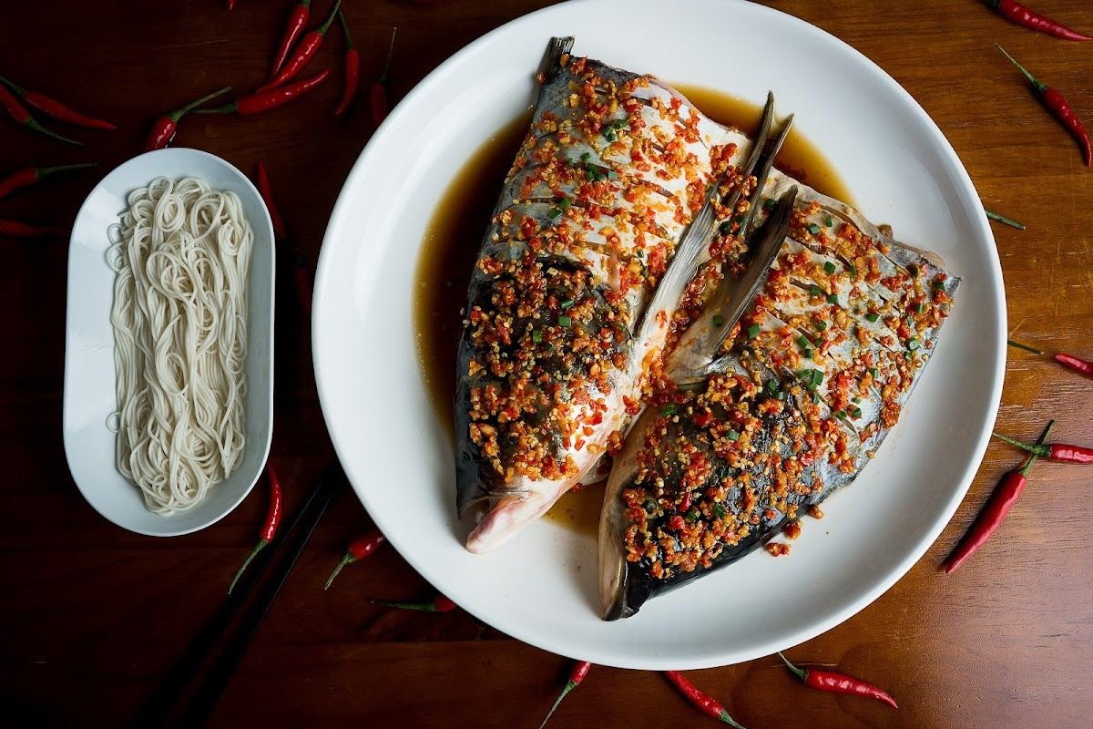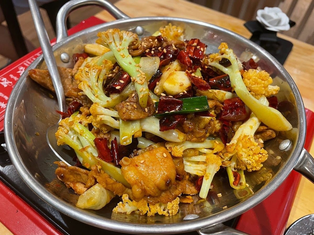 Popular dishes include Steamed Fish Head with homemade Chili, Stir-fried Beef with Parsley, Pork with Roasted Sweet Pepper, Chicken Soup Pot with Handmade Meatball, Sliced Fish, Mushroom, and Egg and more.